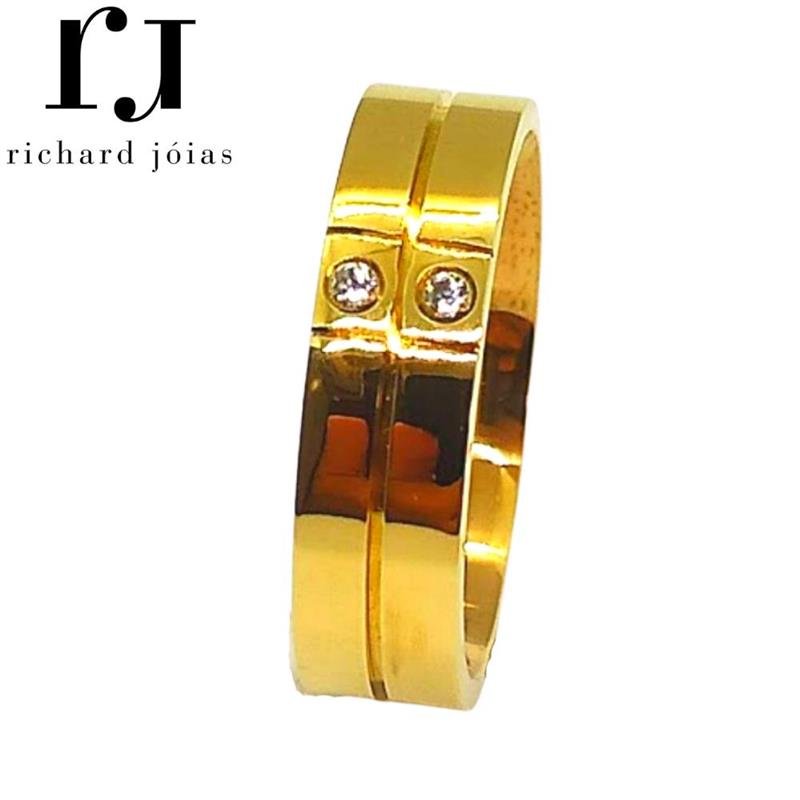ALIANÇA DE MOEDA 6,0MM QUADRADA C/ 2 PEDRAS E 01 FRISO