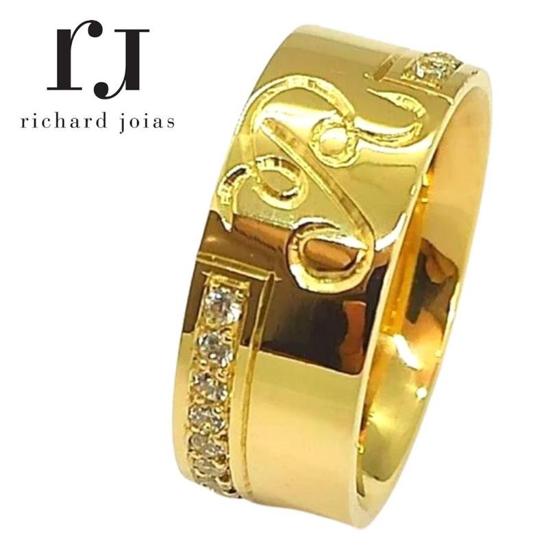 ALIANÇA DE MOEDA 8,0MM ANATÔMICA QUADRADA PERSONALIZADA COM LETRA C/20 PEDRAS E FRISO