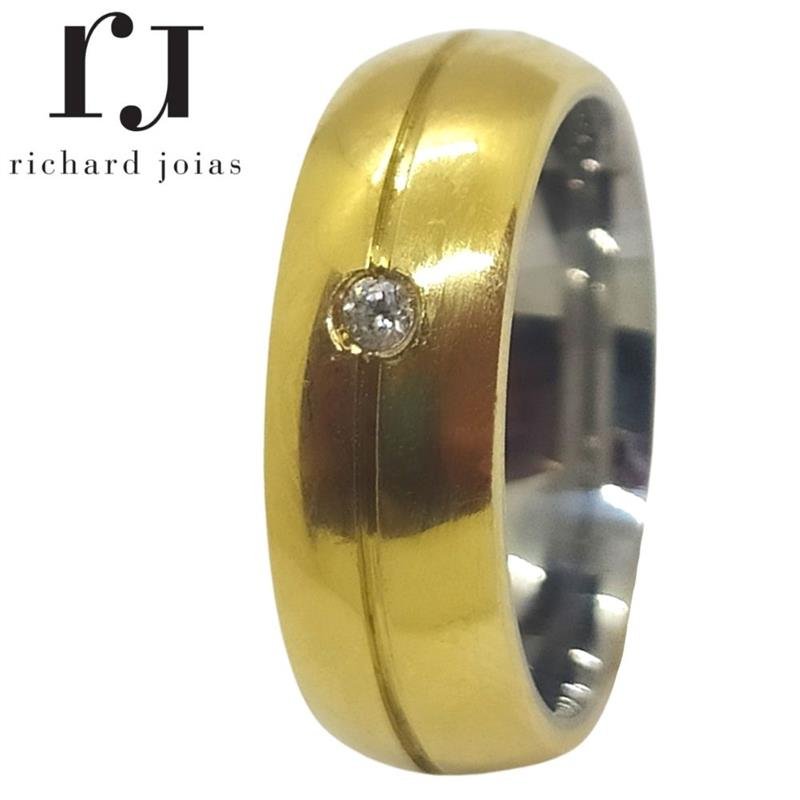 ALIANÇA DE MOEDA C/FORRO DE AÇO 6,0 MM ANATÔMICA ABAULADA C/ 01 FRISO 0,50 E 01 PEDRA