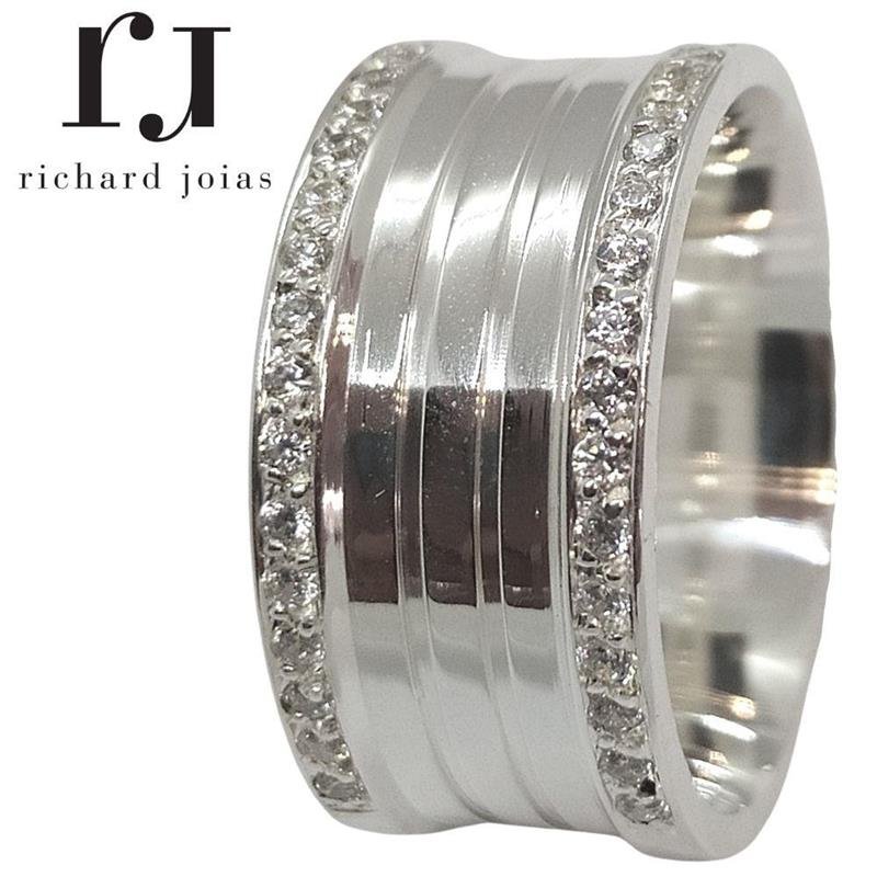 ALIANÇA DE PRATA 10MM ANATÔMICA QUADRADA C/02 FRISOS 0,50 E 30 PEDRAS